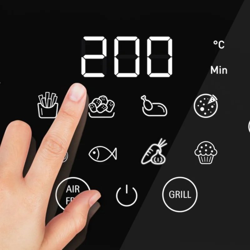 - صفحه کنترل دیجیتال: تنظیم دقیق دما و زمان با صفحه کنترل لمسی دیجیتال که دما را بین 80 تا 200 درجه سانتیگراد تنظیم میکند.