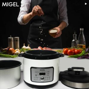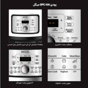 زودپز میگل مدل GPC 106 دستگاهی چند منظوره و با عملکردهایی همچون زودپز، آرام پز، سرخ کن و ماست ساز عرضه شده است. میگل برای این محصول، 12 منوی پخت از پیش تعریف شده را ارائه کرده که می توان مطابق با نوع پخت و هر گونه ذائقهای از برنامه ها استفاده نمود و غذاهایی همانند برنج، سوپ، گوشت، ماهی، مرغ و … را طبخ کرد.زودپز میگل مدل GPC 106 دارای دیگ آلومینیومی با روکش نچسب تفلون است که علاوه بر تهیه غذایی با کیفیت، نگرانی از چسبندگی مواد غذایی به دیگ را از بین برده و همچنین شستشوی ظرف را راحتتر می کند. زودپز Migel GPC-106 با ظرفیت 6 لیتر و توان 1000 واتی، برای خانواده های پر جمعیت بسیار مناسب می باشد.زودپز میگل مدل GPC 106 با طراحی خاص و قابلیت های زیادی که دارد، 2 برابر سریع تر از دیگر زودپزها عمل کرده و امکان پخت غذاهای متنوعی را در کمترین زمان ممکن، میسر می سازد.بر روی بدنه زودپز میگل مدل GPC 106، پنل دیجیتالی تعبیه شده که با انتخاب هر کدام از آنها می توان طبخ مورد نظر را آغاز نمود و یا در صورت لزوم، از عملکرد پخت تاخیری 24 ساعته استفاده کرد.