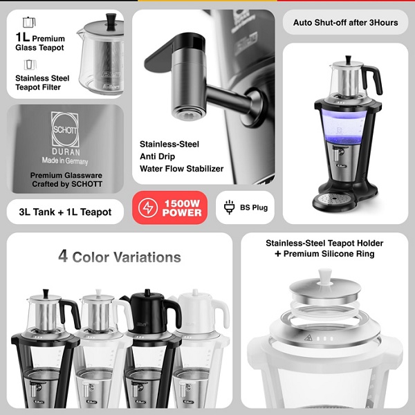 - ظرفیت مناسب: با ظرفیت 3 لیتر برای سماور و 1 لیتر برای قوری، این دستگاه برای استفاده خانوادهها یا مهمانیها ایدهآل است.