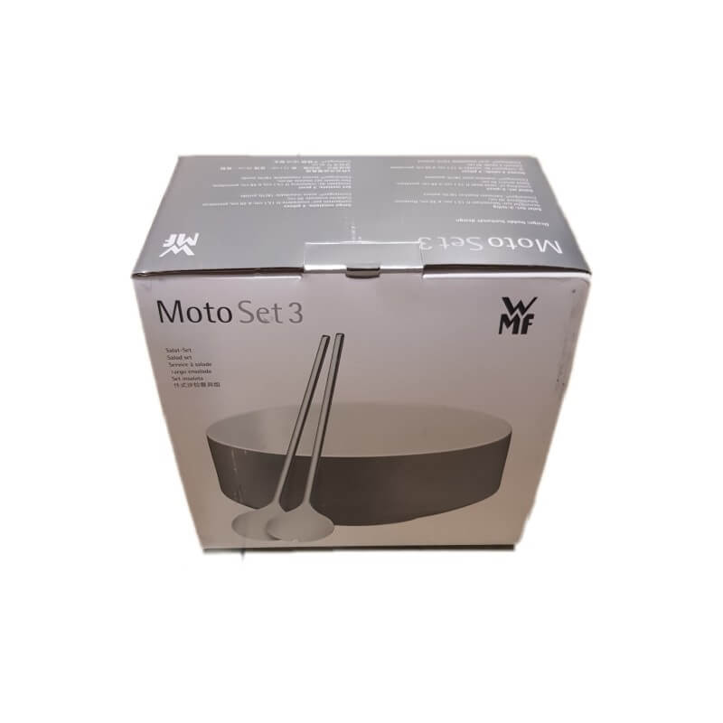 در کاسه دبلیو ام اف مدل WMF Salad set 3pcs Lava grey MOTO تضاد بین شکل حجیم کاسه و ظرافت پردازش مواد ، عنصر سبک برجسته این سری است . جذابیت مجموعه «موتو» غیرقابل انکار است . مواد ، سطوح و رنگهای مختلف تنوع را به میز میآورند . ست سالاد سه تکه شامل کاسه و 2 قاشق است . در لبه های کالا سه قسمت برآمدگی کوچک طراحی شده برای سر نخوردن قاشق ها که به چشم اول شبیه به لب پریدگی می باشد و طراحی کارخانه می باشد .