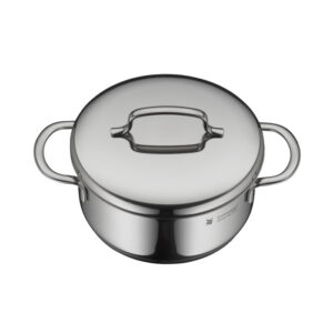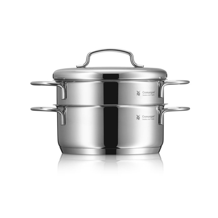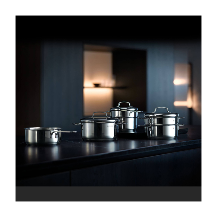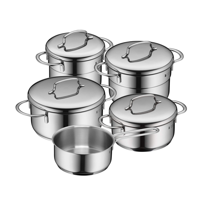 سرویس قابلمه 9 پارچه دبلیو ام اف مدل WMF Mini از 9 قطعه ساخته شده که جنس آن از فولاد کرومارگان ضد زنگ است و به لطف درب استیل با کیفیت بالا که تا 250 درجه سانتیگراد در برابر حرارت مقاوم است . داخل قابلمه ها با درجه بندی مشخص شده آشپزی را راحت تر می کند . کف سه لایه جهانی ثبت شده TransTherm به لطف توزیع و حفظ بهینه گرما ، هنگام پخت و پز در مصرف انرژی صرفه جویی می کند . سایز قابلمه های مینی 12 سانت بلند با حجم 1 لیتر و 14 سانت کوتاه با حجم 0.9 لیتر و 14 سانت بلند با حجم 1.3 لیتر و 16 سانت کوتاه با حجم 1.5 لیتر و شیر جوش 14 سانت با حجم 0.9 لیتر می باشد .
