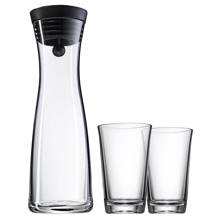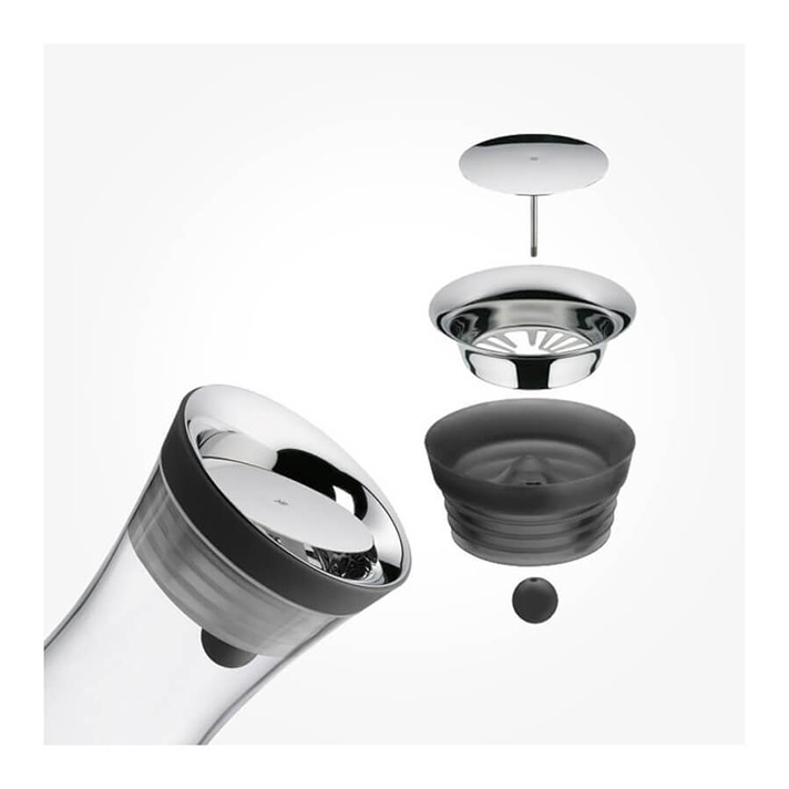 ریختن دقیق بدون قطره : مکانیزم اتوماتیک برای باز و بسته شدن خودکار درب برای جلوگیری از ورود گرد و غبار به داخل پارچ . صافی یکپارچه یخ و تکه های میوه را نگه می دارد و WMF BASIC در قسمت نوشیدنی یخچال های استاندارد قرار می گیرد دهانه بزرگ پر کردن را ساده و راحت می کند تمیز و بهداشتی به لطف درب ، که می تواند برای سهولت نظافت کاملاً جدا شود . پردازش دقیق مواد با کیفیت به این معنی است که پارچ WMF BASIC به راحتی در ماشین ظرفشویی تمیز می شود . جنس : شیشه (مقاوم در برابر حرارت تا 100 درجه سانتی گراد) ، سیلیکون و فولاد ضد زنگ Cromargan 18/10 . بسته شدن CloseUp به کمک مکانیسم کج به طور خودکار باز و بسته می شود و یک صافی یکپارچه هنگام ریختن ، تکه های یخ و تکه های لیمو را در کاراف نگه می دارد . نوشیدنی های گرم نیز می توانند در آن سرو شوند . این ست به همراه 2 عدد لیوان عرضه می شود .