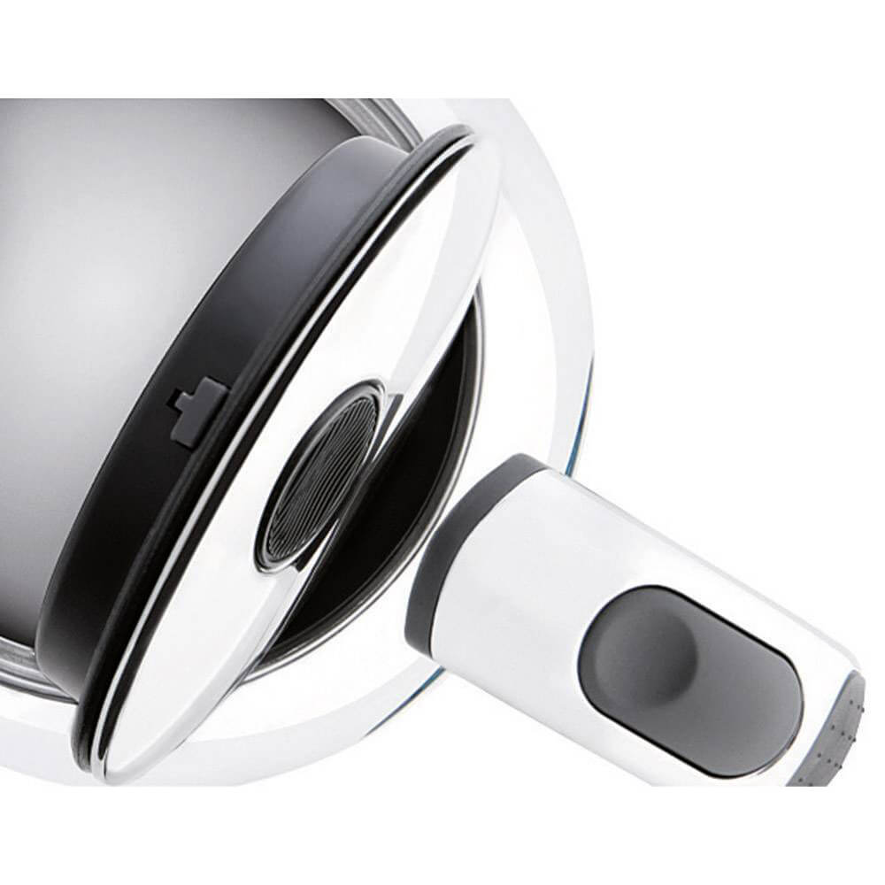 کتری برقی دبلیو ام اف مدل WMF Skyline kettle 1.6 L یک کتری ظریف برای جوشاندن با کارایی بالا را با زیبایی چشمگیر تضمین میکند و ترکیبی از روکش استیل براق و درخشان را ارائه میدهد که حسی از سبک نوین را به هر آشپزخانهای اضافه میکند . باز شدن درب با یک دست با فشار یک دکمه و ظرفیت کامل 1.6 لیتر و طراحی بی سیم 360 درجه پایه و سیم جمع کن در زیر پایه و ویژگی های ایمنی حفاظت از خشک شدن و گرمای بیش از حد و قطع خودکار جوش و درب قفل هوشمند.