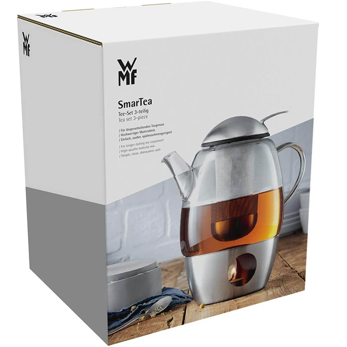 قوری وارمر دار دبلیو ام اف مدل WMF Tea set SmarTea مجموعه ای از سه تکه شامل یک قوری به همراه صافی چای و همچنین وارمر تشکیل شده است . وارمر ساخته شده از فولاد ضد زنگ کرومارگان با روکش مات است و شیشه ی قوری مقاوم در برابر حرارت می باشد . صافی به همراه درب قوری وارد می شود . قوری چای و گرم کن کاملاً هماهنگ هستند و حداکثر لذت چای را تضمین می کنند . برگهای شل چای را در الک قرار دهید ، آب داغ را داخل قوری بریزید و بگذارید مخلوط استراحت کند . در همین حال ، چراغ چای را در گرمکن روشن کنید و صبر کنید تا چای به اندازه کافی دم کشیده شود . چای برای چند ساعت روی گرم کننده گرم می ماند . WMF مجموعه های چای را با طرح های مختلف ارائه می دهد که همیشه از ترکیب مواد با کیفیت بالا Cromargan® و شیشه با کیفیت مقاوم در برابر حرارت ساخته شده است . اشکال هماهنگ و مواد با کیفیت بالا چایخواران و دوستدار طراحی را تحت تأثیر مجموعه SmarTea قرار خواهد داد . ظرف قوری حدود 1 لیتر ظرفیت دارد ، همه قسمت ها برای تمیز کردن با ماشین ظرفشویی سازگار هستند .