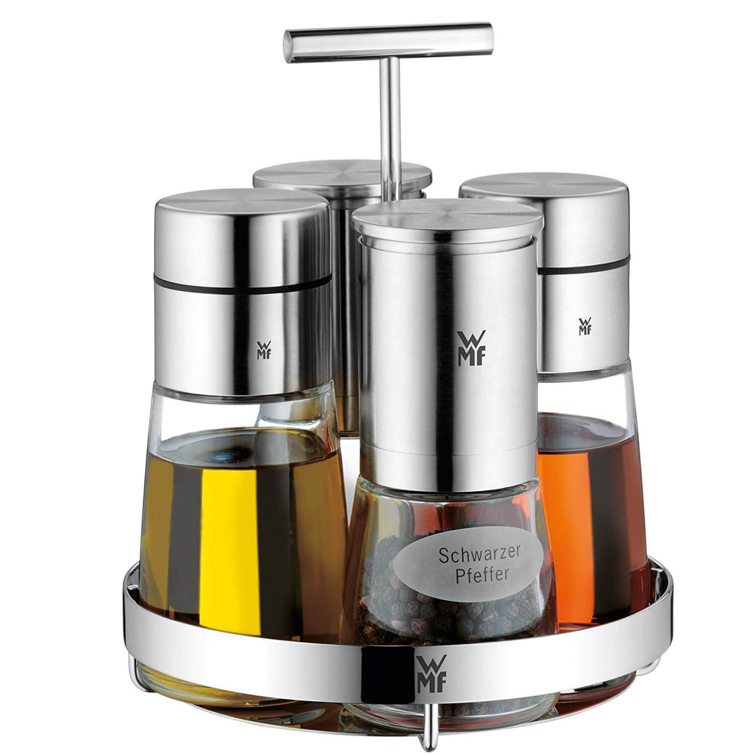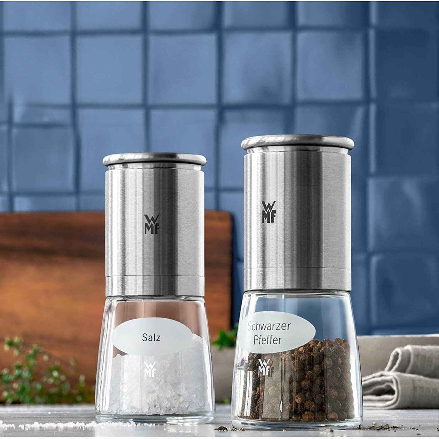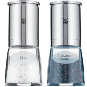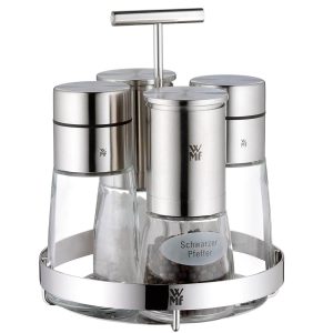 فلفل و نمک ساب 5 پارچه دبلیو ام اف مدل WMF DE LUXE Salt & pepper grinder ایده آل برای میز . آسیاب سرامیکی اصلی سخت تر از فولاد است و نه تنها نمک و فلفل را آسیاب می کند ، بلکه گیاهان خشک و ادویه جات را نیز آسیاب می کند . اینگونه است که طعم گیاهان تازه را در تمام طول سال به سفره می آورید . با ست “De Luxe” می توانید به مهمانان خود اجازه دهید تا چیزهای جالبی را تجربه کنند . آسیاب های شیک سرامیل د لوکس در هر میز ناهارخوری چشم نوازی می کنند . مطابق با آسیاب ها ، این محدوده با کریت ها ، میزهای رومیزی و ظرف سرکه/روغن تکمیل می شود .