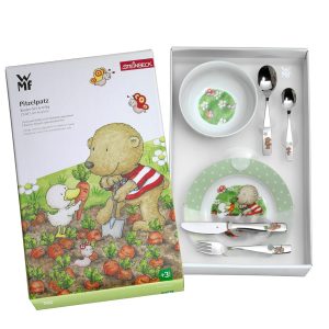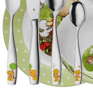 یادگیری غذا خوردن در حال حاضر برای کوچولوها لذت بخش است : مجموعه های کودکان 6 تکه از محصولات WMF بر اساس مهارت های حرکتی کودکان سه سال به بالا طراحی شده است و در صبحانه و شام داستان های هیجان انگیزی را بیان می کند . کارد و چنگال 4 تکه ساخته شده از فولاد ضد زنگ 18/10 و همچنین یک بشقاب و کاسه غلات ساخته شده از پرسلن ( روکش فوق الاده شفاف و زیبا که در صنعت روکش دندان هم استفاده می شود ) تشکیل شده است . تزئینات کارد و چنگال و ظروف دارای نقوش مختلف است ، با دقت پردازش می شود و قابل شستشو در ماشین ظرفشویی است . ست بچه ها در همه وعده ها همراهان شادی هستند و هر میز را تزیین می کنند . چاقوی بچه ها دارای لبه کمی دندانه دار است. لبه قاشق دارای لبه های گرد است. شاخک های کوتاه و بلندی چنگال کودکان با دهان کودکان کوچک سازگار است .